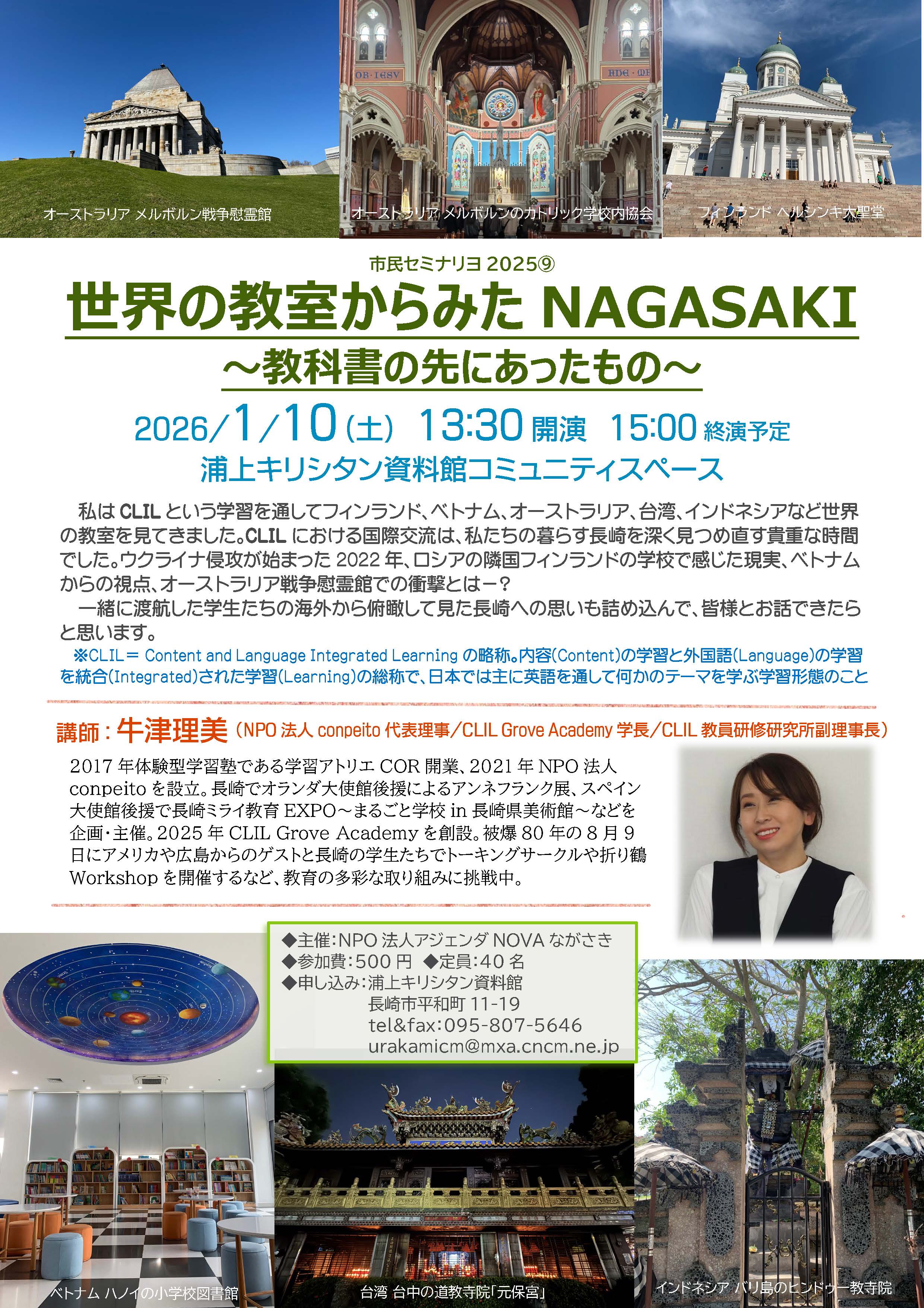市民セミナリヨ2025H 世界の教室からみたNAGASAKI 〜教科書の先にあったもの〜 ![]() flyer(pdf 1.6Mb) |