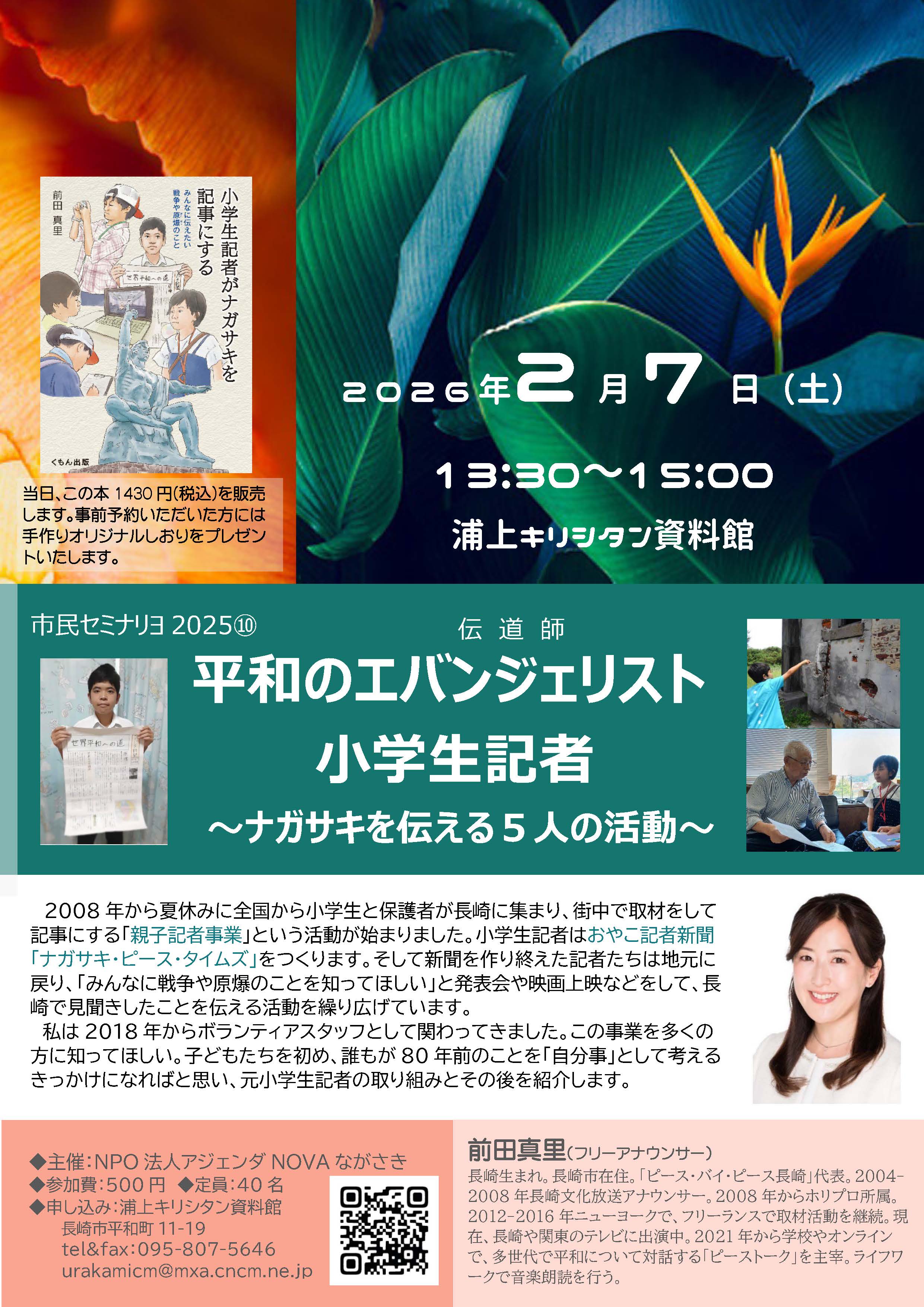 ●主旨: 2008年から夏休みに全国から小学生と保護者が長崎に集まり、街中で取材をして記事にする「親子記者事業」という活動が始まりました。小学生記者はおやこ記者新聞「ナガサキ・ピース・タイムズ」をつくります。そして新聞を作り終えた記者たちは地元に戻り、「みんなに戦争や原爆のことを知ってほしい」と発表会や映画上映などをして、長崎で見聞きしたことを伝える活動を繰り広げています。 私は2018年からボランティアスタッフとして関わってきました。この事業を多くの方に知ってもらいたいと思い、今回は5人の小学生記者の活動とその後を紹介します。 ぜひ、聴きにきてください。 ![]() ●講師:前田真里(フリーアナウンサー) 長崎生まれ。長崎市在住。「ピース・バイ・ピース長崎」代表。2004-2008年長崎文化放送アナウンサー。2008年からホリプロ所属。2012-2016年ニューヨークで、フリーランスで取材活動を継続。現在、長崎や関東のテレビに出演中。2021年から学校やオンラインで、多世代で平和について対話する「ピーストーク」を主宰。ライフワークで音楽朗読を行う。