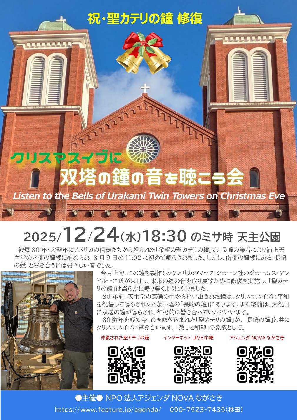 ●主旨: | 被爆80年・大聖年にアメリカの信徒たちから贈られた「希望の聖カテリの鐘」は、長崎の業者により浦上天主堂の北側の鐘楼に納められ、8月9日の11:02に初めて鳴らされました。しかし、南側の鐘楼にある「長崎の鐘」と響き合うには弱々しい音でした。 今月上旬、この鐘を製作したアメリカのマック・シェーン社のジェームス・アンドルーエ氏が来日し、本来の鐘の音を取り戻すために修復を実施し、「聖カテリの鐘」は高らかに鳴り響くようになりました。 80年前、天主堂の瓦礫の中から拾い出された鐘は、クリスマスイブに平和を祝福して鳴らされたと永井隆の「長崎の鐘」にあります。また戦前は、大祝日に双塔の鐘が鳴らされ、神秘的に響き合っていたといいます。 80数年を経て今、命を吹き込まれた「聖カテリの鐘」が、「長崎の鐘」と共にクリスマスイブに響き合います。「赦しと和解」の象徴として。。。