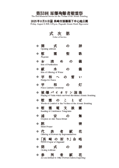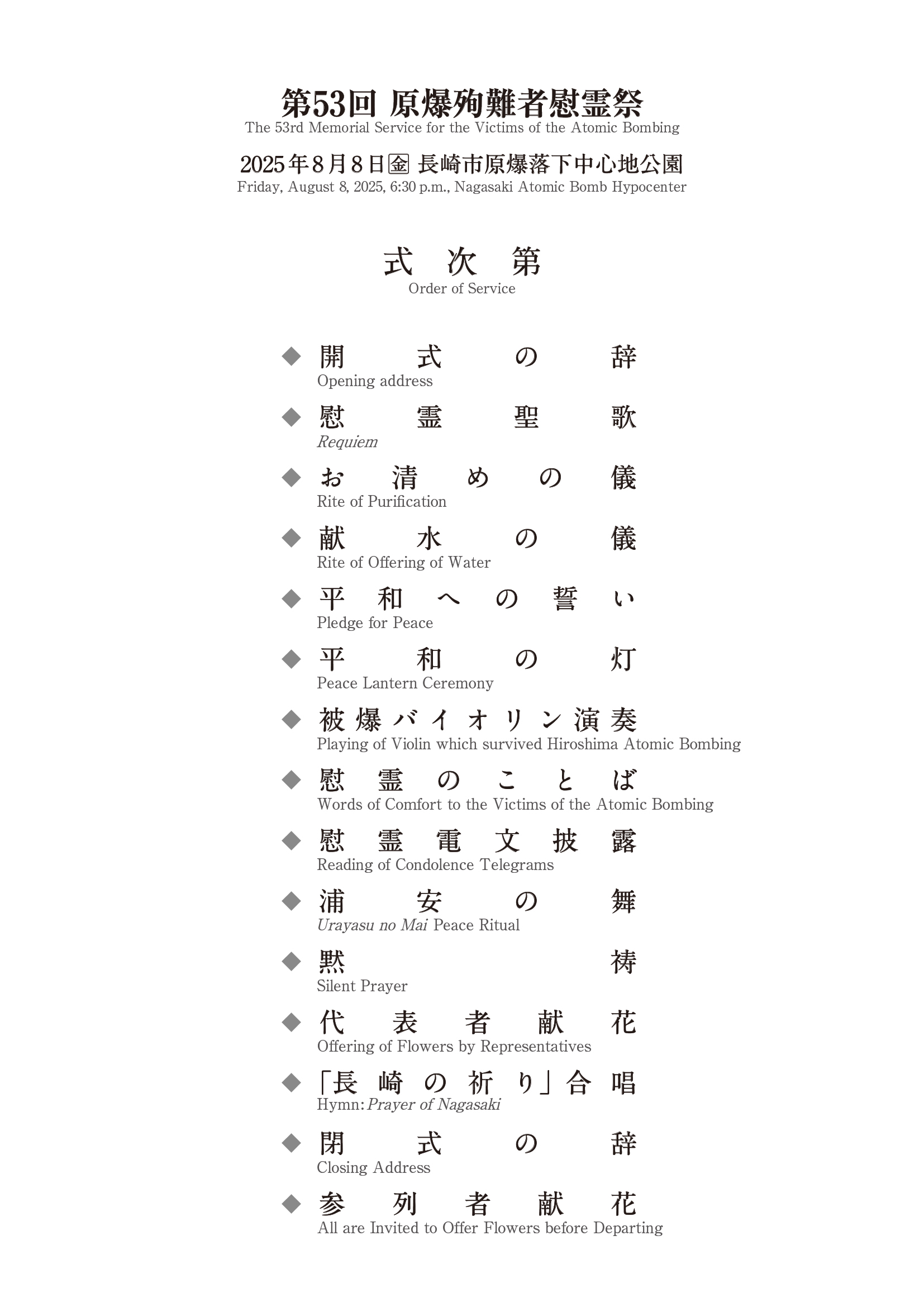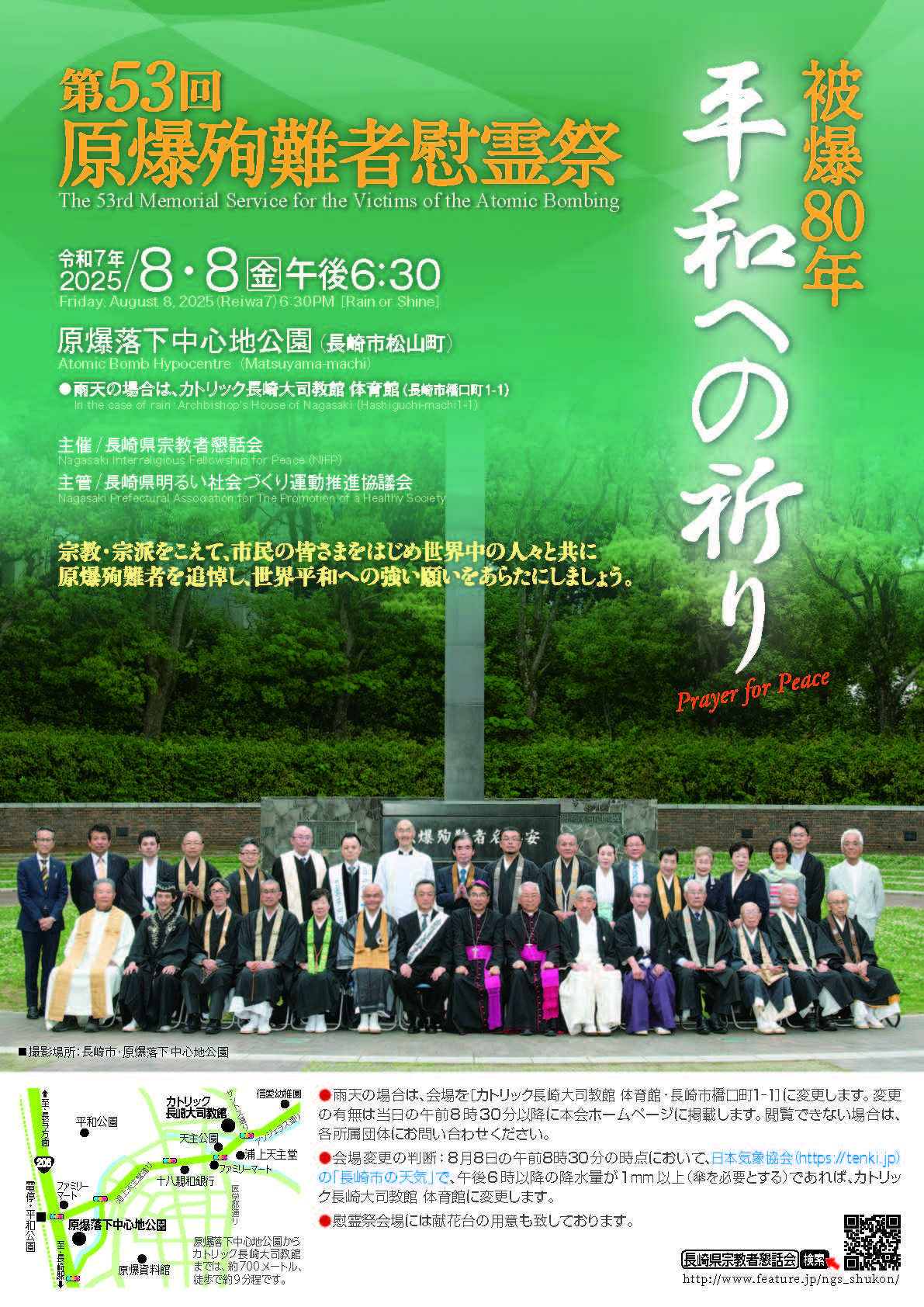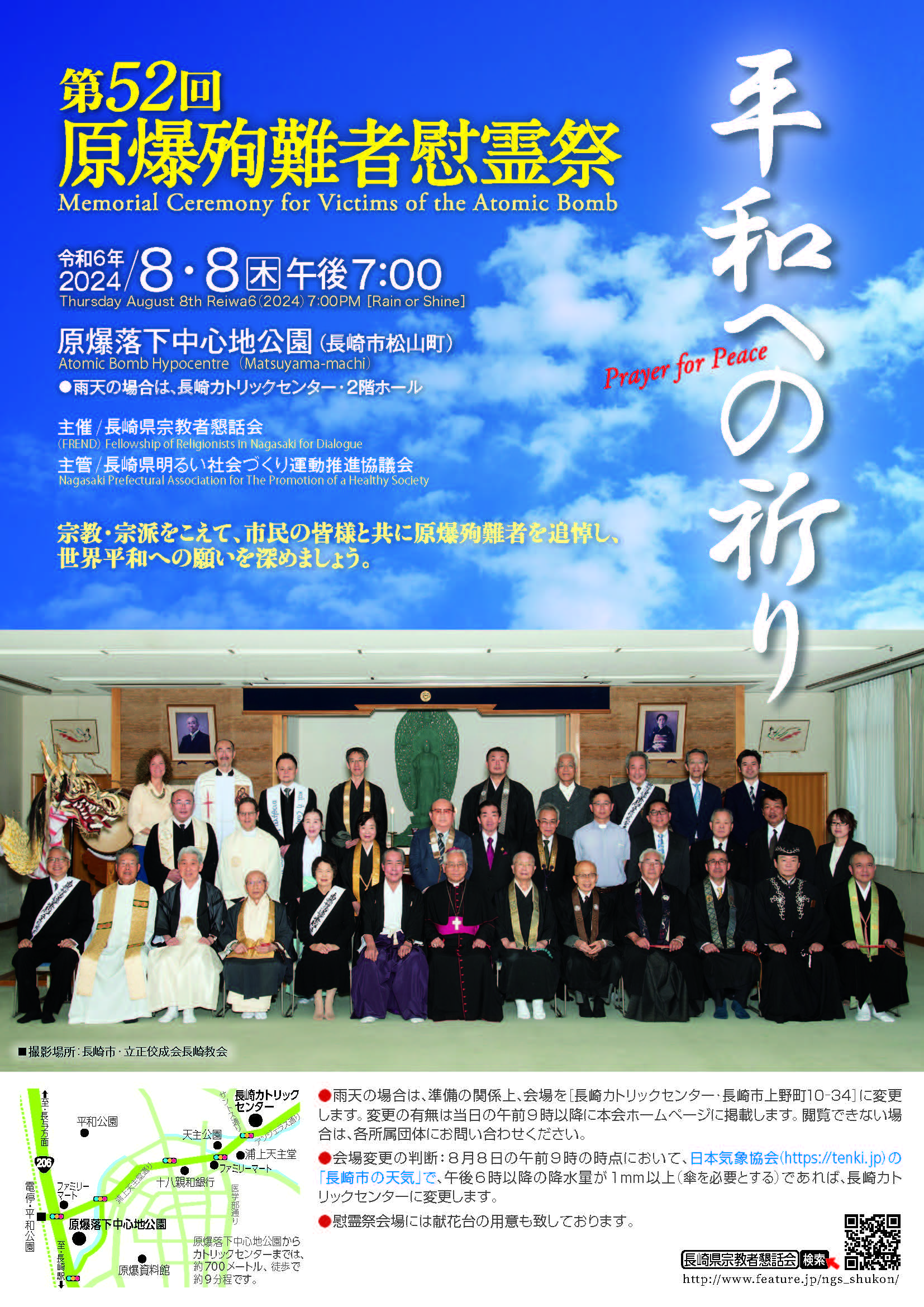 理事会・定例会・望年会(サンプリエール) ・8/27 被爆80年 宗教者によるシンポジウムとレセプション、第53回原爆殉難者慰霊祭 反省会(マルシェ・ド・リッシュ) ・8/8 第53回原爆殉難者慰霊祭 平和への祈り(爆心地公園) ・8/7 諸宗教者によるシンポジウムとレセプション(サンプリエール) ・7/3 理事会・定例会 ・6/6 8・8慰霊祭実行委員会 ・5/16 8.8平和への祈りポスター撮影会(爆心地公園)&定例会 ・5/8 宗懇とフォコラーレとの懇親 ・4/24 出射さんを囲む会 ・1/20 理事会・年次総会・新年会 2024年度活動実績 ・12/17 理事会・定例会・宗懇発足50周年記念フォーラム・祝賀会(写真) (動画) ・9/9 理事会・定例会・懇親会 ・8/8 第52回原爆殉難者慰霊祭(平和への祈り)のアーカイブ動画 ・8/7 懇親交流の夕べ ・7/3-4 理事会・定例会/8.8慰霊祭実行委員会 ・6/17 Kwibuca30 in 長崎のアーカイブ動画 ・6/16 8.8慰霊祭チラシ ・6/7 8.8慰霊祭実行委員会 ・5/17 8.8慰霊祭ポスター撮影・定例会 ・4/9-11 諸宗教聖地巡礼 アーカイブ動画 ・3/25 岡保夫宗教者懇話会会長 告別式(メモリード典礼会館) ・3/7-8 広島長崎宗教者平和会議 ・2/25 平和揮毫 in 浦上天主堂 ・1/22 理事会・総会・新年会 |